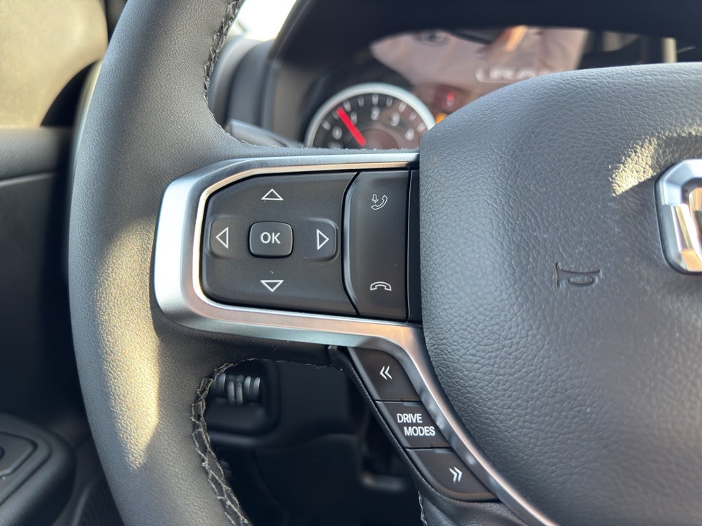 Quick Order Package 27Z Big Horn. Big Horn Level 2 Equipment Group: Google Android Auto; SiriusXM Radio Service; USB Host Flip; Power Adjustable Pedals; Leather Wrapped Steering Wheel; Integrated Voice Command with Bluetooth®; 12" Touchscreen Display; Glove Box Lamp; Auto Power-Folding Mirrors; 115V Auxiliary Rear Power Outlet; Media Hub with 2 Charge Only USBs; Heated Front Seats; Security Alarm; Black Premium Power Mirrors; Apple CarPlay; Premium Overhead Console; 9 Amplified Speakers with Subwoofer; Disassociated Touchscreen Display; Body Color Fender Flares; Remote Tailgate Release; 115V Auxiliary Power Outlet; LED Dome Lamp with On/off Switch; Universal Garage Door Opener; 2nd Row in Floor Storage Bins; Sun Visors with Illuminated Vanity Mirrors; LED Footwell Lighting; Rear Window Defroster; Integrated Center Stack Radio; Rear View Auto Dim Mirror; Rear Power Sliding Window; Connectivity - US/Canada; GPS Navigation; 4G LTE Wi-Fi Hot Spot; GPS Antenna Input; Overhead LED Lamps; Exterior Mirrors with Heating Element; Auto Dim Exterior Driver Mirror; SiriusXM with 360L; Global Telematics Box Module; Connected Travel and Traffic Services; Heated Steering Wheel; Black Exterior Mirrors; Configurable Drive Mode; 400W Inverter; HD Radio; Deluxe Cloth Bucket Seats; Uconnect 5 Navigation with 12.0" Display Radio; Exterior Mirrors with Supplemental Signals; Steering Wheel Mounted Audio Controls; Exterior Mirrors Courtesy Lamps; Air Conditioning ATC with Dual Zone Control; Cluster 7.0" TFT Color Display; Convex Wide-Angle Exterior Mirror Insert. Night Edition: 275/55R20 OWL All Season Tires; Accent Color Premium Power Mirrors; Exterior Mirrors with Supplemental Signals; Black Headlamp Bezels; Exterior Mirrors Courtesy Lamps; Grille Black Surround Black Mesh; Auto Power-Folding Mirrors; Exterior Mirrors with Heating Element; 20" X 9.0" Aluminum Painted Clad Wheels; Auto Dim Exterior Driver Mirror; Black Exterior Truck Badging; Anti-Spin Differential Rear Axle; Accent Color Door Handles; Accent Color Tailgate Handle; Black Interior Accents; Dual Exhaust with Black Tips; Body Color Front Bumper; Convex Wide-Angle Exterior Mirror Insert; Body Color Rear Bumper with Step Pads; Black Tail Lamp Bezels; RAM Grille Badge - Black; Black Painted Exterior Mirrors Caps; Rear Wheelhouse Liners. Quick Order Package 23Z Big Horn. 9 Amplified Speakers with Subwoofer. Anti-Spin Differential Rear Axle. Trailer Brake Control. Diamond Black Crystal PC. MyFlexCare Service Plan. MOPAR Front and Rear Rubber Floor Mats. 3.92 Rear Axle Ratio. **Equipment listed is based on original vehicle build and subject to change. Please confirm the accuracy of the included equipment by calling the dealer prior to purchase.**
